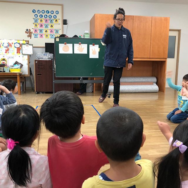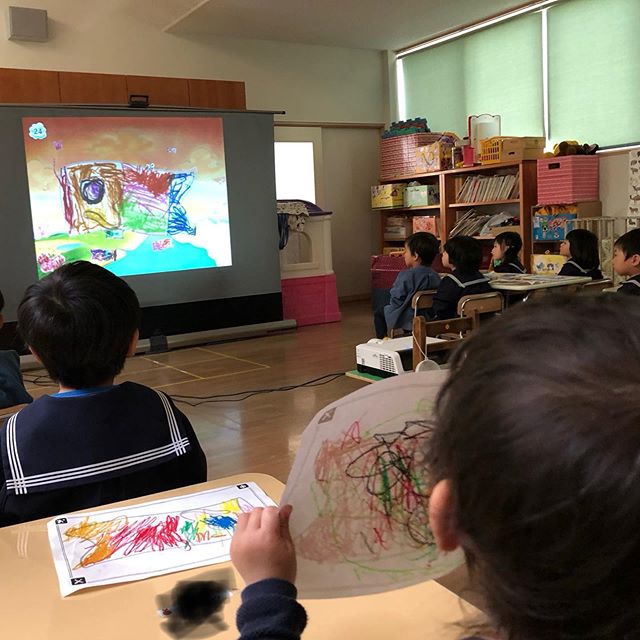 今日は3歳児クラスのKitSの日。手前に写っているSくんは自分が塗ったこいのぼりがスクリーンに映し出されて大喜びの大興奮(≧∀≦)