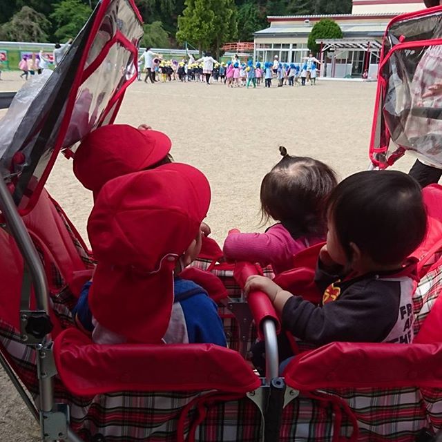 大きい組のお兄さんお姉さんの体操を見て、一緒にやりたいなぁ〜と一番小さい組の子供たちが車に乗って羨ましそうに見てま〜す(*^_^*)