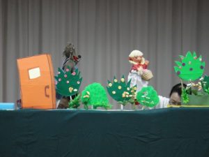 人形劇サークル「サークルアン」による、「雪の女王」の紙芝居や数え歌、新聞紙シアターや手遊びうた、赤ずきんの人形劇など、盛り沢山の内容を観せてくれました。