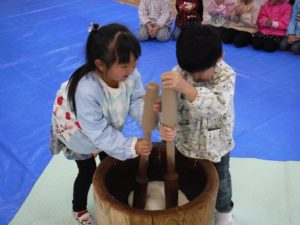 お正月の行事に欠かせない「もちつき」を幼稚園でも体験させようということで、PTA行事として今年で29回目を迎えました。