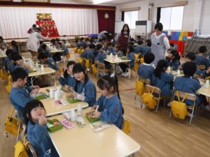 もうすぐ卒業する年長組のお兄さんお姉さんと一緒に給食を食べるのは最後となります。思い出などを話しながら楽しく会食をしていました。