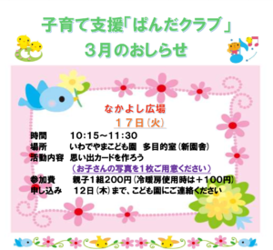 8月の土曜保育について 2019 7/31 お知らせ 2019年7月31日 8月の土曜保育も通常通り行います。土曜保育を希望する方は、これまで通り黄色い「土曜保育連絡票」を、希望日1日につき1枚、その週の月曜日までに必ず提出してください。よろしくお願いします。 いわでやまこども園 お知らせ よかったらシェアしてね! URLをコピーしました! URLをコピーしました! 8/4(日)のPTA夏行事について もも組さんスイカプールのデビューでした(o^^o)楽しいよ〜 この記事を書いた人 認定いわでやまこども園 関連記事 子育て支援「ぱんだクラブ」お知らせ 2026.3月号 2026年3月3日 子育て支援「ぱんだクラブ」お知らせ 2026.2月号 2026年2月1日 子育て支援「ぱんだクラブ」お知らせ 2026.1月号 2025年12月24日 子育て支援「ぱんだクラブ」お知らせ 2025.12月号 2025年12月2日 子育て支援「ぱんだクラブ」お知らせ 2025.11月号 2025年10月30日 子育て支援「ぱんだクラブ」お知らせ 2025.10月号 2025年10月1日 見学会を11月、12月にも開催 2025年9月25日 子育て支援「ぱんだクラブ」お知らせ 2025.9月号 2025年8月30日 コメント コメントする コメントをキャンセルコメント ※ 名前 ※ メール ※ サイト 次回のコメントで使用するためブラウザーに自分の名前、メールアドレス、サイトを保存する。 上に表示された文字を入力してください。 Δ このサイトはスパムを低減するために Akismet を使っています。コメントデータの処理方法の詳細はこちらをご覧ください。