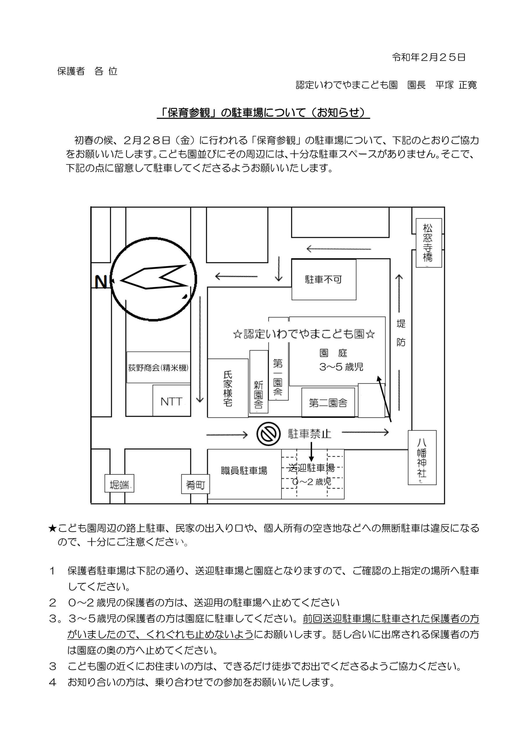 保育参観駐車場について 2020 2/25 お知らせ 2020年2月25日 お知らせ よかったらシェアしてね! URLをコピーしました! URLをコピーしました! 避難訓練 絵本贈呈^_^ この記事を書いた人 いわでやまこども園スタッフ 関連記事 子育て支援「ぱんだクラブ」お知らせ 2026.1月号 2025年12月24日 子育て支援「ぱんだクラブ」お知らせ 2025.12月号 2025年12月2日 子育て支援「ぱんだクラブ」お知らせ 2025.11月号 2025年10月30日 子育て支援「ぱんだクラブ」お知らせ 2025.10月号 2025年10月1日 見学会を11月、12月にも開催 2025年9月25日 子育て支援「ぱんだクラブ」お知らせ 2025.9月号 2025年8月30日 子育て支援「ぱんだクラブ」お知らせ 2025.8月号 2025年8月6日 エラー復旧のお知らせ 2025年7月24日 コメント コメントする コメントをキャンセルコメント ※ 名前 ※ メール ※ サイト 次回のコメントで使用するためブラウザーに自分の名前、メールアドレス、サイトを保存する。 上に表示された文字を入力してください。 Δ このサイトはスパムを低減するために Akismet を使っています。コメントデータの処理方法の詳細はこちらをご覧ください。