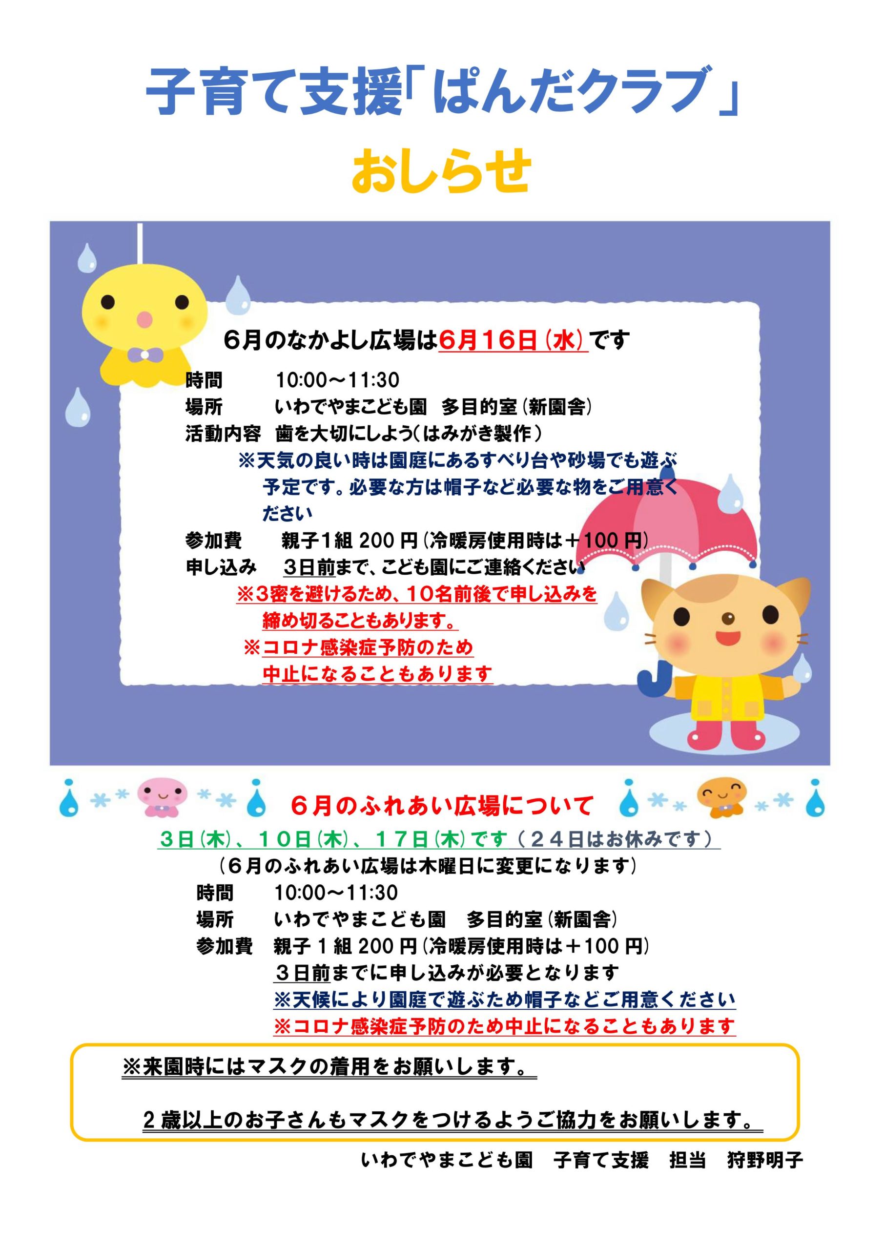 6月の子育て支援について 2021 6/02 お知らせ 2021年6月2日 お知らせ よかったらシェアしてね! URLをコピーしました! URLをコピーしました! これなに? 新しいアイテム✌️ この記事を書いた人 いわでやまこども園スタッフ 関連記事 子育て支援「ぱんだクラブ」お知らせ 2026.1月号 2025年12月24日 子育て支援「ぱんだクラブ」お知らせ 2025.12月号 2025年12月2日 子育て支援「ぱんだクラブ」お知らせ 2025.11月号 2025年10月30日 子育て支援「ぱんだクラブ」お知らせ 2025.10月号 2025年10月1日 見学会を11月、12月にも開催 2025年9月25日 子育て支援「ぱんだクラブ」お知らせ 2025.9月号 2025年8月30日 子育て支援「ぱんだクラブ」お知らせ 2025.8月号 2025年8月6日 エラー復旧のお知らせ 2025年7月24日 コメント コメントする コメントをキャンセルコメント ※ 名前 ※ メール ※ サイト 次回のコメントで使用するためブラウザーに自分の名前、メールアドレス、サイトを保存する。 上に表示された文字を入力してください。 Δ このサイトはスパムを低減するために Akismet を使っています。コメントデータの処理方法の詳細はこちらをご覧ください。