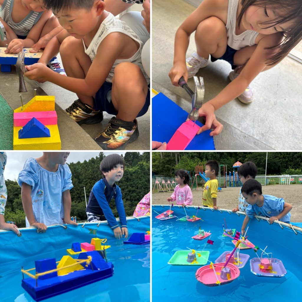舟浮かべ 2025 7/21 ブログ 2025年7月11日2025年7月21日 年長さんは木材とカナヅチで 年少、年中さんはお肉などのトレーやプリンカップ、ストローなどなどの廃材を使って 自分だけの舟をつくりましたよ( ◠‿◠ ) みんなの舟がかっこよく浮かんでよかったね♡ ブログ よかったらシェアしてね! URLをコピーしました! URLをコピーしました! 夏だー!! 英語であそぼう参観 この記事を書いた人 kodomoen_mayu 関連記事 お箸練習 2026年2月25日 保育参観 2026年2月20日 防災頭巾 2026年2月10日 節分 2026年2月3日 小学校に行ってきました! 2026年1月27日 食育 2026年1月26日 雪遊び! 2026年1月22日 入念な準備 2026年1月20日