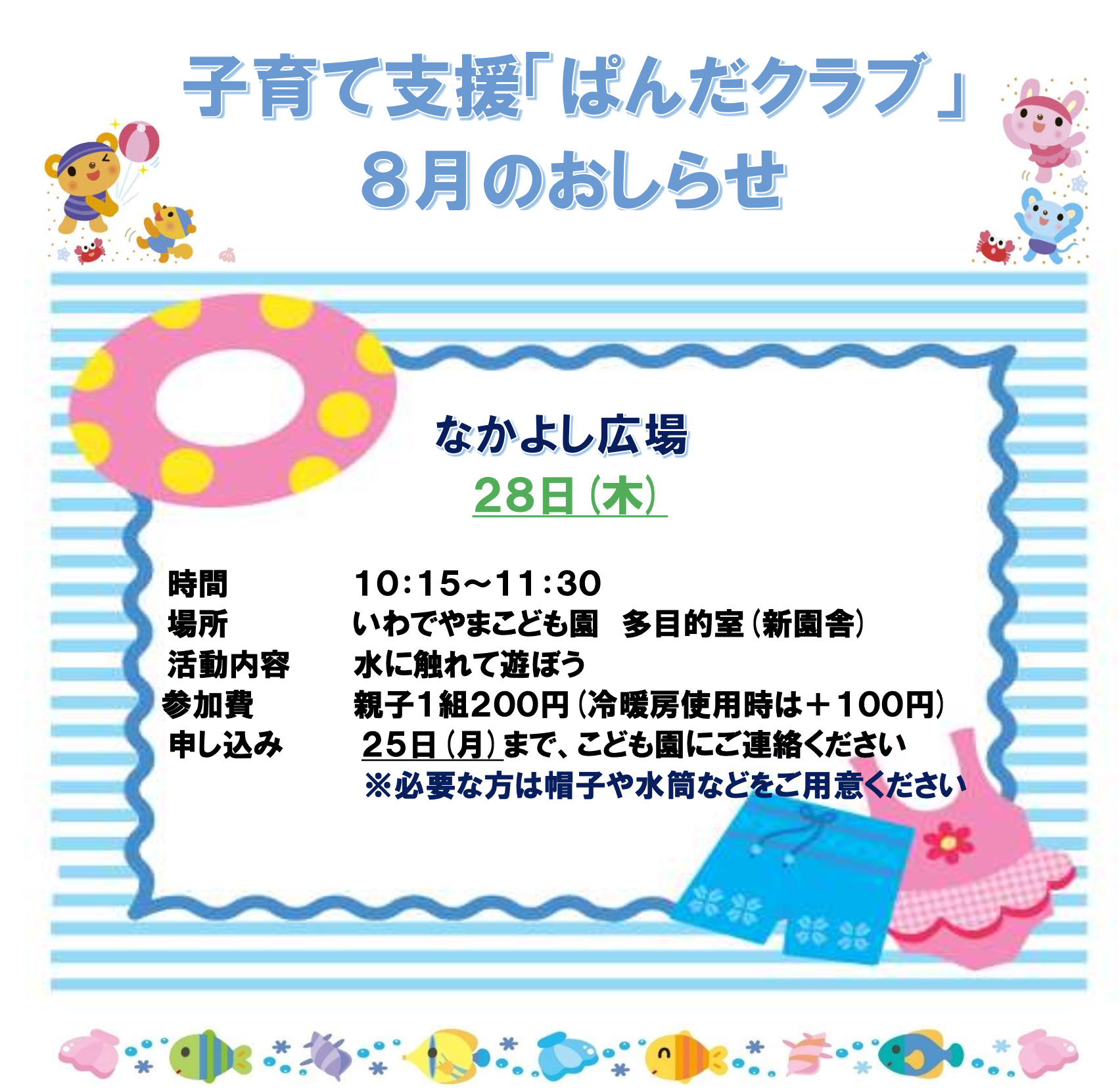 子育て支援「ぱんだクラブ」お知らせ 2025.8月号 2025 8/06 お知らせ 2025年8月6日 子育て支援「ぱんだクラブ」お知らせ2025.8月号です。下記からダウンロードしていただけます。 子育て支援お知らせ8月ダウンロード お知らせ よかったらシェアしてね! URLをコピーしました! URLをコピーしました! PTA行事〜親子ふれあい遊び 始業式 この記事を書いた人 web_admin 関連記事 子育て支援「ぱんだクラブ」お知らせ 2026.2月号 2026年2月1日 子育て支援「ぱんだクラブ」お知らせ 2026.1月号 2025年12月24日 子育て支援「ぱんだクラブ」お知らせ 2025.12月号 2025年12月2日 子育て支援「ぱんだクラブ」お知らせ 2025.11月号 2025年10月30日 子育て支援「ぱんだクラブ」お知らせ 2025.10月号 2025年10月1日 見学会を11月、12月にも開催 2025年9月25日 子育て支援「ぱんだクラブ」お知らせ 2025.9月号 2025年8月30日 エラー復旧のお知らせ 2025年7月24日 コメント コメントする コメントをキャンセルコメント ※ 名前 ※ メール ※ サイト 次回のコメントで使用するためブラウザーに自分の名前、メールアドレス、サイトを保存する。 上に表示された文字を入力してください。 Δ このサイトはスパムを低減するために Akismet を使っています。コメントデータの処理方法の詳細はこちらをご覧ください。