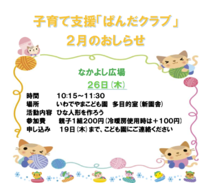 子育て支援「ぱんだクラブ」お知らせ 2025.11月号 2025 10/30 お知らせ 2025年10月30日 子育て支援「ぱんだクラブ」お知らせ2025.11月号です。下記からダウンロードしていただけます。 子育て支援お知らせ11月ダウンロード お知らせ よかったらシェアしてね! URLをコピーしました! URLをコピーしました! 色塗り最高! 完成したよ! この記事を書いた人 web_admin 関連記事 子育て支援「ぱんだクラブ」お知らせ 2026.2月号 2026年2月1日 子育て支援「ぱんだクラブ」お知らせ 2026.1月号 2025年12月24日 子育て支援「ぱんだクラブ」お知らせ 2025.12月号 2025年12月2日 子育て支援「ぱんだクラブ」お知らせ 2025.10月号 2025年10月1日 見学会を11月、12月にも開催 2025年9月25日 子育て支援「ぱんだクラブ」お知らせ 2025.9月号 2025年8月30日 子育て支援「ぱんだクラブ」お知らせ 2025.8月号 2025年8月6日 エラー復旧のお知らせ 2025年7月24日 コメント コメントする コメントをキャンセルコメント ※ 名前 ※ メール ※ サイト 次回のコメントで使用するためブラウザーに自分の名前、メールアドレス、サイトを保存する。 上に表示された文字を入力してください。 Δ このサイトはスパムを低減するために Akismet を使っています。コメントデータの処理方法の詳細はこちらをご覧ください。