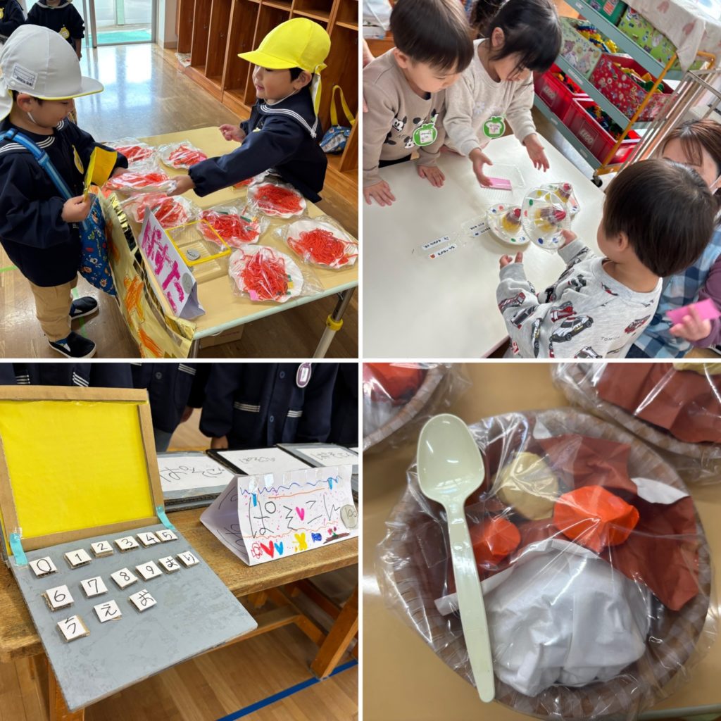 お店やごっこ 2025 12/01 ブログ 2025年11月21日2025年12月1日 今年も開店しました! たくさんの手作りお店! パソコン、カレー、ドーナツ、メガネ、などなど たくさんのお店が並びましたよ。 元気いっぱいの『いらっしゃいませぇ!』の声が響き、肩かけかばんパンパンになるまでたくさん買い物ができました! ブログ よかったらシェアしてね! URLをコピーしました! URLをコピーしました! 完成したよ! 餅つき会 この記事を書いた人 kodomoen_mayu 関連記事 クリスマスおゆうぎ会〜0.1.2歳児〜 2025年12月13日 クリスマスおゆうぎ会〜3.4.5歳児〜 2025年12月13日 餅つき会 2025年11月28日 完成したよ! 2025年10月30日 色塗り最高! 2025年10月24日 さつまいも掘り 2025年10月23日 観劇 2025年10月20日 英語であそぼう 2025年10月20日
