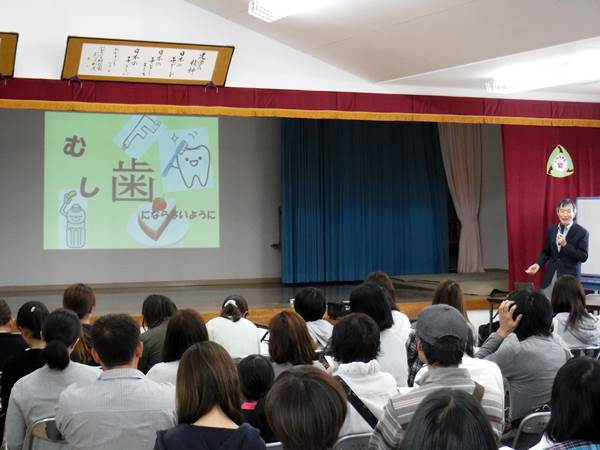 保護者の皆さんは、ホールで歯科医の前原雄二先生を講師に招いて、「虫歯にならないために」というテーマのもとにお話をしていただきました。